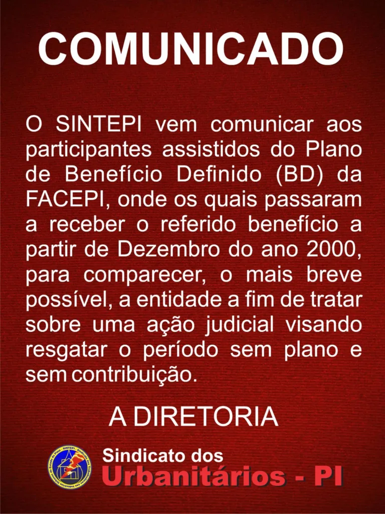 O SINTEPI – Sindicato dos Urbanitários do Estado do Piauí comunica aos participantes assistidos do Plano de Benefício Definido (BD) da FACEPI, que passaram a receber o referido benefício a partir de dezembro do ano 2000, a necessidade de comparecerem o mais breve possível à entidade.