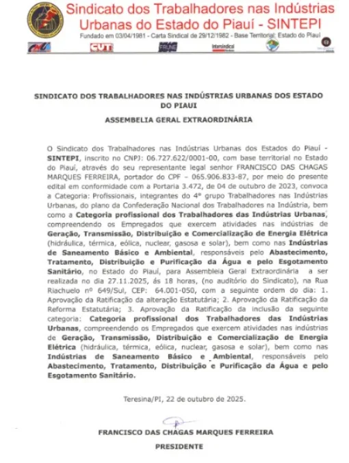 O SINTEPI convoca todos(as) os(as) trabalhadores(as) das Indústrias Urbanas do Piauí para participarem da Assembleia Geral Extraordinária, que será realizada no dia 27/11/2025, às 18h, no auditório do Sindicato, localizado na Rua Riachuelo, 649 – Centro/Sul, Teresina.